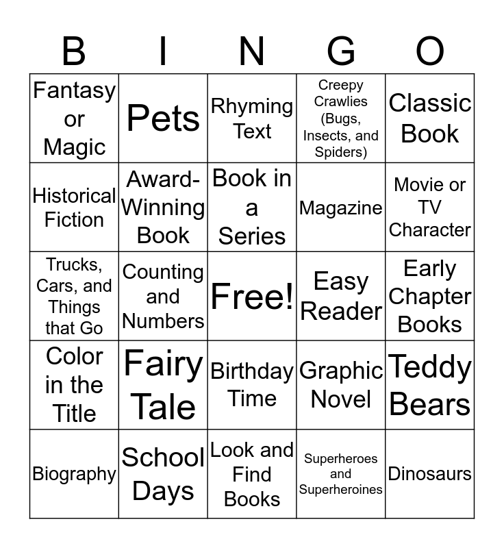 This bingo card has a free space and 39 words: Alphabet Book, Animal on the Cover, Audiobook, Award-Winning Book, Biography, Birthday Time, Book in a Series, Cars, Trucks, and Things that Go, Classic Book, Color in the Title, Counting and Numbers, Creepy Crawlies (Bugs, Insects, and Spiders), Dinosaurs, Early Chapter Books, Easy Reader, Fairy Tale, Family, Fantasy or Magic, From Another Planet, Graphic Novel, Historical Fiction, Look and Find Books, Magazine, Movie or TV Character, New Book (2019), Nighttime or Sleeping, Nonfiction, Ocean and Fish, One Word Title, Pets, Poetry, Red Cover, Rhyming Text, School Days, Superheroes and Superheroines, Tall Tales, Teddy Bears, Trucks, Cars, and Things that Go and Wordless Picture Books.