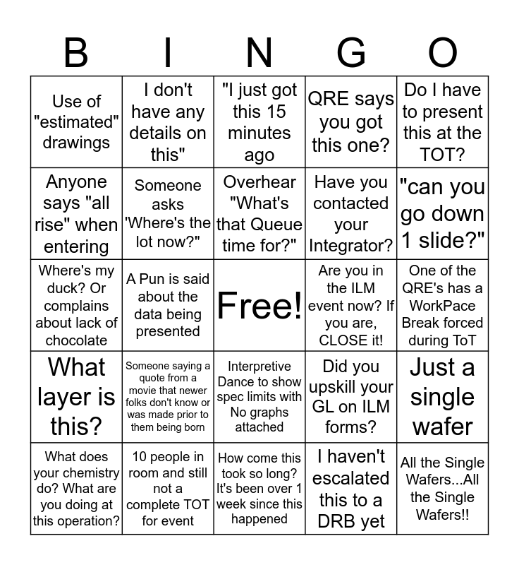 This bingo card has a free space and 28 words: Just a single wafer, "I feel this should be low risk", Have you contacted your Integrator?, I haven't escalated this to a DRB yet, Anyone says "all rise" when entering, "I just got this 15 minutes ago, I don't have any details on this", What layer is this?, Are you in the ILM event now? If you are, CLOSE it!, What does your chemistry do? What are you doing at this operation?, Where's my duck? Or complains about lack of chocolate, QRE says you got this one?, 10 people in room and still not a complete TOT for event, How come this took so long? It's been over 1 week since this happened, "can you go down 1 slide?", Brian or other high level manager attends TOT. This can include entire Litho dept attending to support 1 event., Someone saying a quote from a movie that newer folks don't know or was made prior to them being born, Someone asks 'Where's the lot now?", Overhear "What's that Queue time for?", Interpretive Dance to show spec limits with No graphs attached, Use of "estimated" drawings, Someone asks "Who's presenting?", All the Single Wafers...All the Single Wafers!!, A Pun is said about the data being presented, One of the QRE's has a WorkPace Break forced during ToT, Did you upskill your GL on ILM forms?, Do I have to present this at the TOT? and Somebody uses a Line from Andrea's List.
