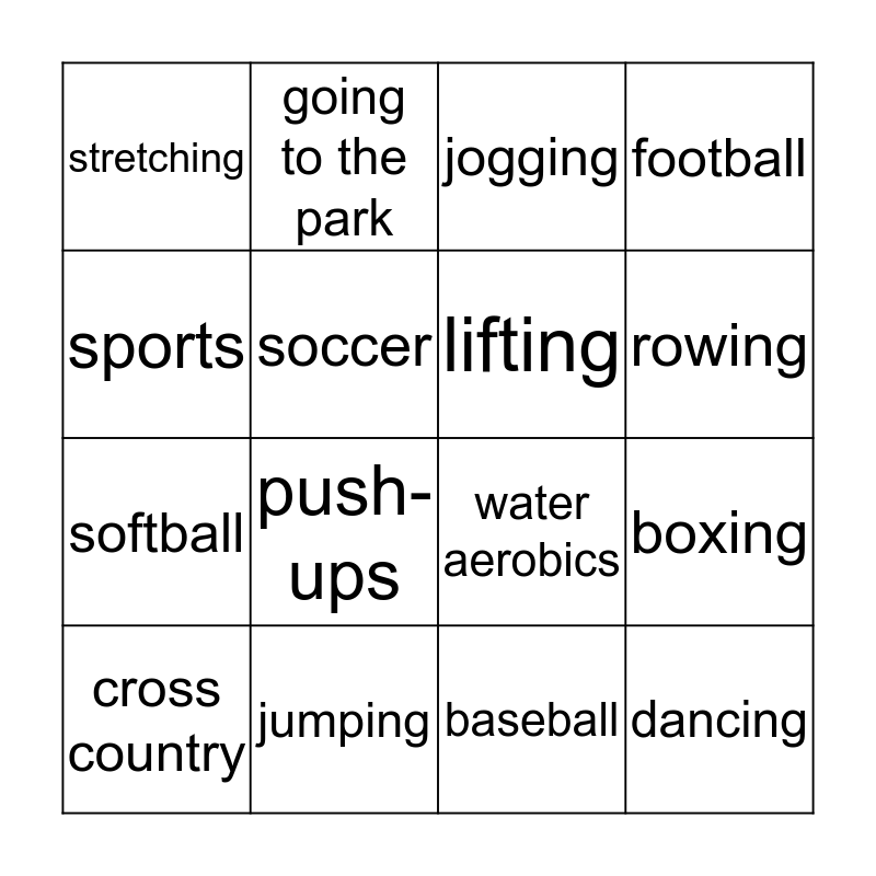 This bingo card has 32 words: running, walking, boxing, yoga, dancing, lifting, sports, karate, going to the park, swimming, rowing, jogging, biking, cycling, jumping, golfing (without a cart), working with resistance bands, water aerobics, stationary bike riding, jump rope, basketball, volleyball, baseball, track, cross country, football, softball, soccer, stretching, pilates, heavy gardening (shoveling and digging) and push-ups.