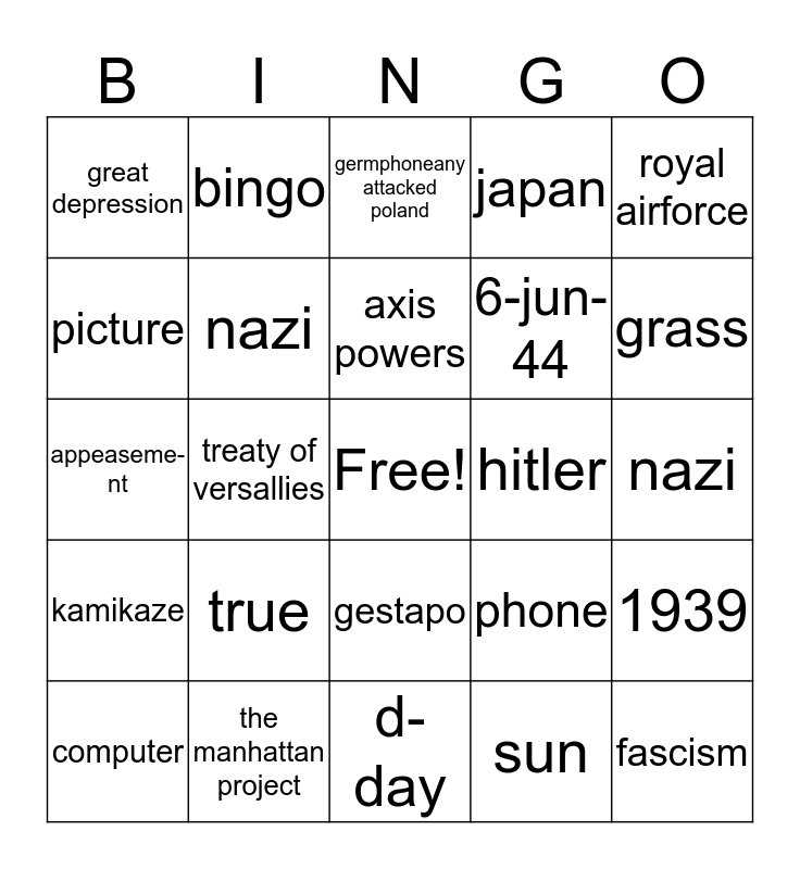 This bingo card has a free space and 41 words: fascism, appeaseme-nt, Blitzkrieg, nazi, the manhattan project, gestapo, axis powers, the final solution, royal airforce, kamikaze, treaty of versallies, japan, fascism, nazi, hitler, true, appeaseme-nt, great depression, false, germphoneany attacked poland, 1939, battle of britain, d-day, 6-jun-44, cake, bread, sun, sky, grass, weather, birds, bingo, computer, tablet, phone, picture, ring, light, star, night and day.
