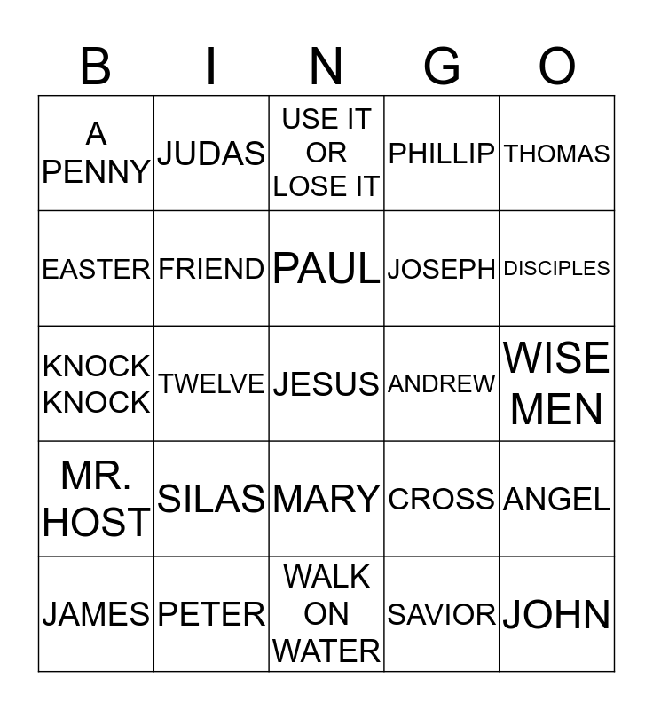 This bingo card has a free space and 24 words: SILAS, PETER, PAUL, JAMES, THOMAS, A PENNY, EASTER, JUDAS, ANDREW, MARY, JOSEPH, KNOCK KNOCK, CROSS, ANGEL, FRIEND, SAVIOR, WISE MEN, USE IT OR LOSE IT, DISCIPLES, TWELVE, JOHN, MR. HOST, PHILLIP and WALK ON WATER.