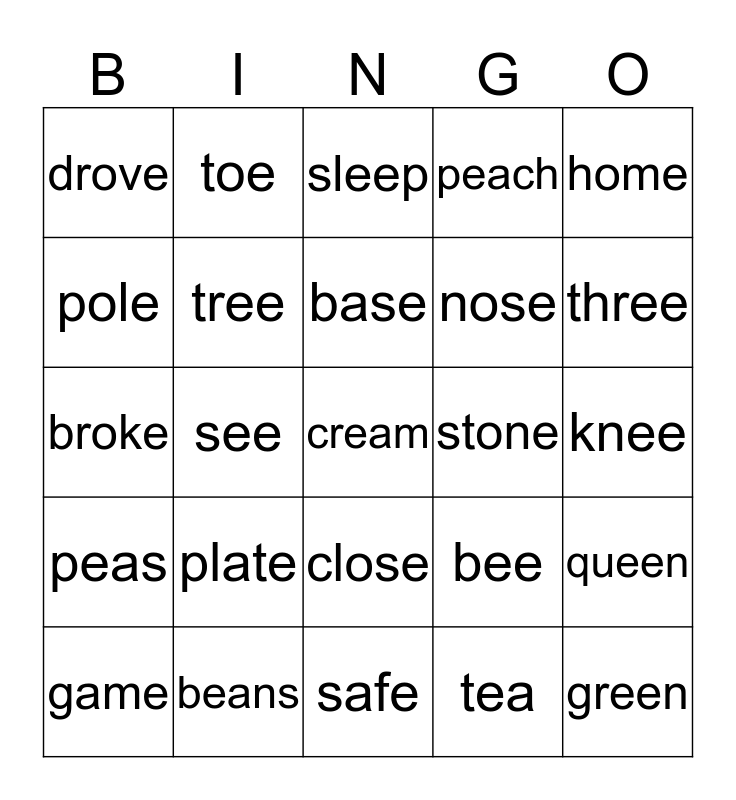 This bingo card has 25 words: plate, safe, base, game, home, drove, pole, toe, stone, close, nose, broke, bee, queen, tree, green, knee, sleep, three, see, cream, beans, peas, peach and tea.