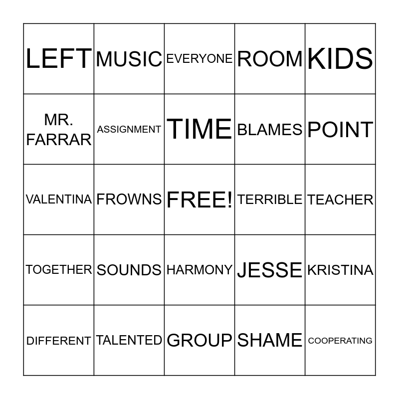 This bingo card has a free space and 24 words: SOUNDS, TALENTED, TIME, DIFFERENT, KIDS, LEFT, MR. FARRAR, MUSIC, TERRIBLE, HARMONY, BLAMES, VALENTINA, JESSE, KRISTINA, ASSIGNMENT, SHAME, TEACHER, EVERYONE, POINT, FROWNS, COOPERATING, TOGETHER, ROOM and GROUP.