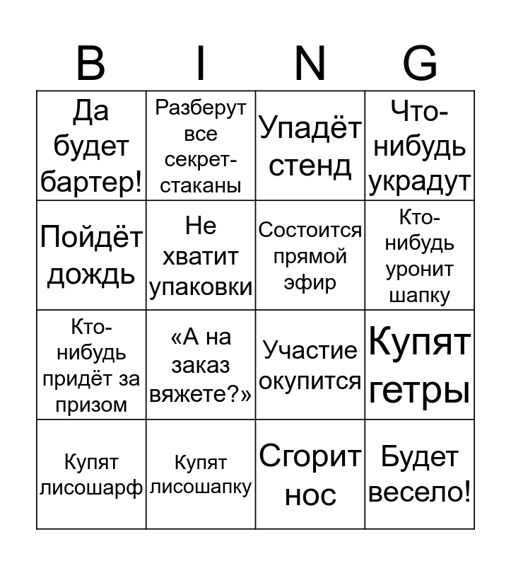 This bingo card has 16 words: Купят лисошарф, Купят лисошапку, Упадёт стенд, Что-нибудь украдут, Пойдёт дождь, Разберут все секрет-стаканы, Участие окупится, Купят гетры, Да будет бартер!, Не хватит упаковки, Сгорит нос, Кто-нибудь уронит шапку, Кто-нибудь придёт за призом, «А на заказ вяжете?», Состоится прямой эфир and Будет весело!.
