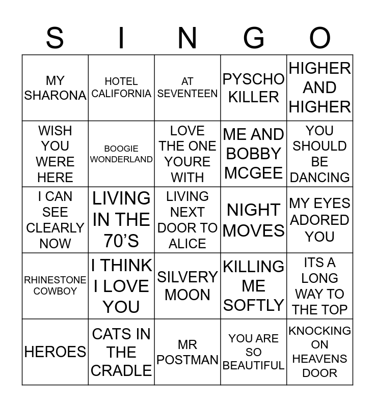 This bingo card has 25 words: I THINK I LOVE YOU, MR POSTMAN, LOVE THE ONE YOURE WITH, HEROES, HIGHER AND HIGHER, MY SHARONA, WISH YOU WERE HERE, HOTEL CALIFORNIA, NIGHT MOVES, SILVERY MOON, ME AND BOBBY MCGEE, I CAN SEE CLEARLY NOW, KILLING ME SOFTLY, ITS A LONG WAY TO THE TOP, BOOGIE WONDERLAND, KNOCKING ON HEAVENS DOOR, MY EYES ADORED YOU, AT SEVENTEEN, YOU SHOULD BE DANCING, LIVING IN THE 70’S, LIVING NEXT DOOR TO ALICE, CATS IN THE CRADLE, RHINESTONE COWBOY, PYSCHO KILLER and YOU ARE SO BEAUTIFUL.