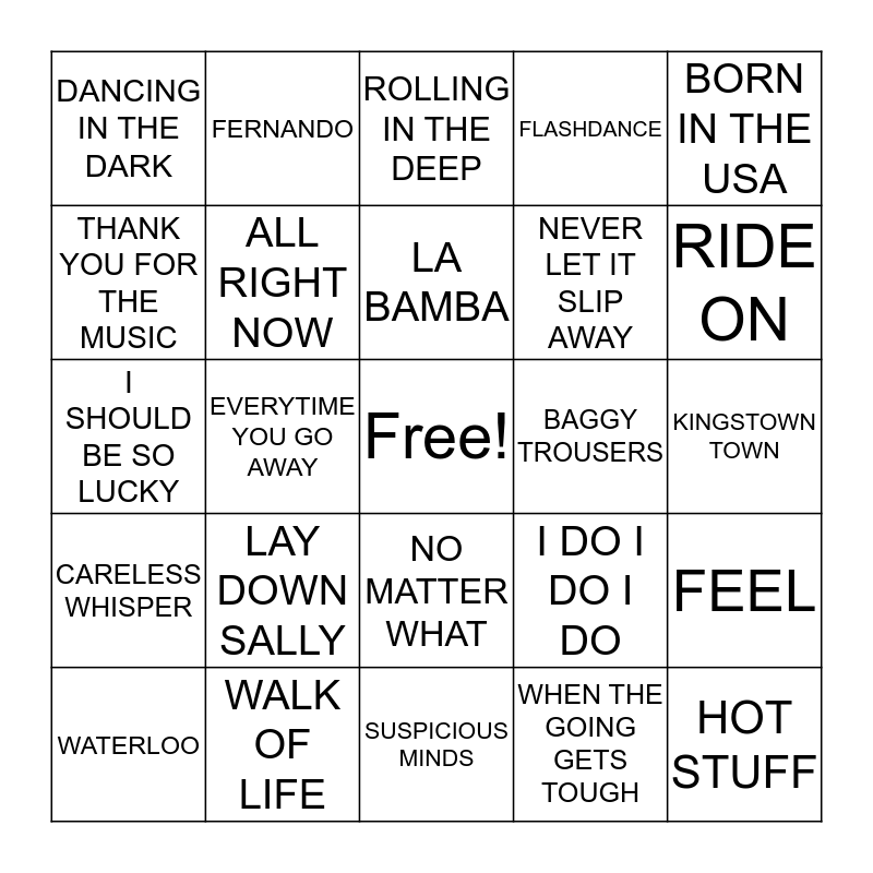 This bingo card has a free space and 41 words: CHASING CARS, I SHOULD BE SO LUCKY, CANDY, ALL RIGHT NOW, WALK OF LIFE, NO MATTER WHAT, LA BAMBA, BABY JANE, BORN IN THE USA, CARELESS WHISPER, EVERYTIME YOU GO AWAY, FLASHDANCE, HOT STUFF, KINGSTOWN TOWN, BAGGY TROUSERS, LAY DOWN SALLY, BUILD ME UP BUTTERCUP, DANCING IN THE DARK, CHAIN REACTION, ROLLING IN THE DEEP, FEEL, A MILLION LOVE SONGS, SUSPICIOUS MINDS, NEVER LET IT SLIP AWAY, ONE MAN BAND, ROCK THE BOAT, WHEN THE GOING GETS TOUGH, SUMMER HOLIDAY, RIDE ON, MY HEART WILL GO ON, MAMA MIA, FERNANDO, WATERLOO, ITS A HEARTACHE, I DO I DO I DO, THANK YOU FOR THE MUSIC, YOUR STILL THE ONE, THE LEAVING OF LIVERPOOL, HOT LEGS, THE COMBINE HARVESTER SONG and THEN I KISSED HER.