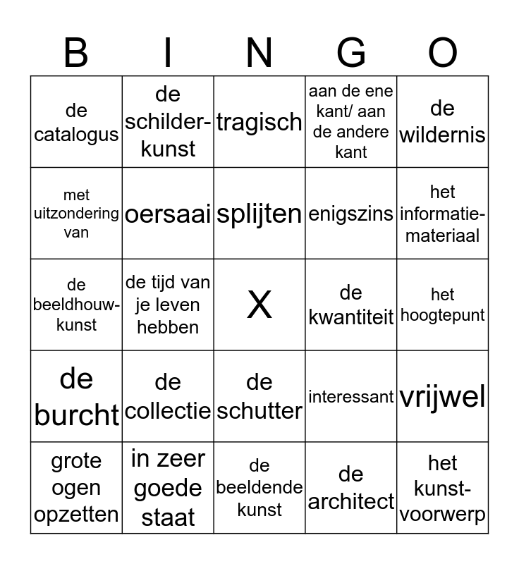 This bingo card has a free space and 36 words: de recensie, het argument, het oordeel, oersaai, interessant, de burcht, splijten, overigens, de wildernis, de smaak, de tijd van je leven hebben, aan de ene kant/ aan de andere kant, de kwaliteit, de kwantiteit, het informatie-materiaal, de catalogus, de folder, de collectie, het kunst-voorwerp, tragisch, het hoogtepunt, vrijwel, in zeer goede staat, grote ogen opzetten, de beeldende kunst, de schilder-kunst, de beeldhouw-kunst, de overeenkomst, enigszins, met uitzondering van, de schulden, bankroet, de architect, de schutter, een drukte van belang and de wacht houden.