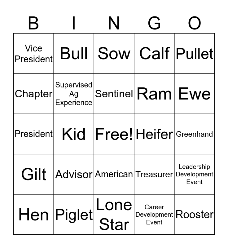 This bingo card has a free space and 34 words: E.M. Tiffany, Discovery, Whether, Boar, Greenhand, Chapter, Supervised Ag Experience, Lone Star, Ram, Rooster, President, Bull, Career Development Event, Barrow, Gilt, Kid, American, Heifer, Leadership Development Event, Hen, Piglet, Lamb, Calf, Ewe, Chick, Advisor, Sow, Doe, Pullet, Vice President, Secretary, Sentinel, Treasurer and Steer.