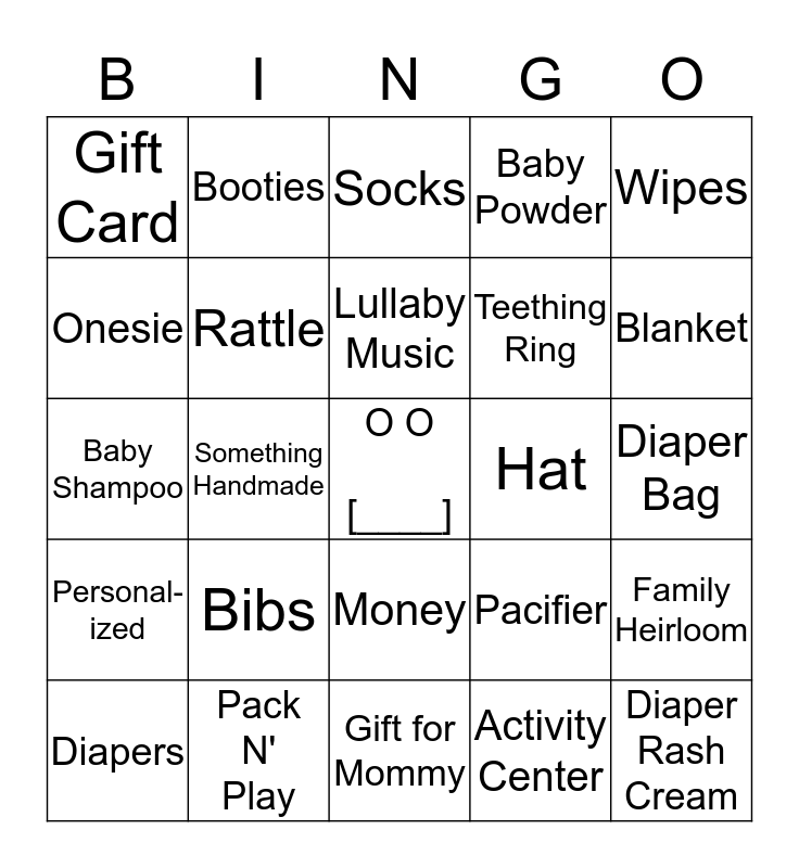 This bingo card has a free space and 24 words: Bibs, Pack N' Play, Lullaby Music, Diapers, Wipes, Gift Card, Onesie, Booties, Hat, Money, Teething Ring, Baby Shampoo, Pacifier, Family Heirloom, Rattle, Activity Center, Diaper Bag, Socks, Blanket, Something Handmade, Diaper Rash Cream, Personal- ized, Baby Powder and Gift for Mommy.