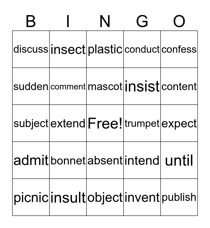 This bingo card has a free space and 28 words: until, contest, insist, invent, sudden, plastic, insect, admit, trumpet, picnic, subject, conduct, insult, object, content, suspect, bonnet, comment, mascot, absent, discuss, nutmeg, publish, extend, expect, intend, confess and mustang.