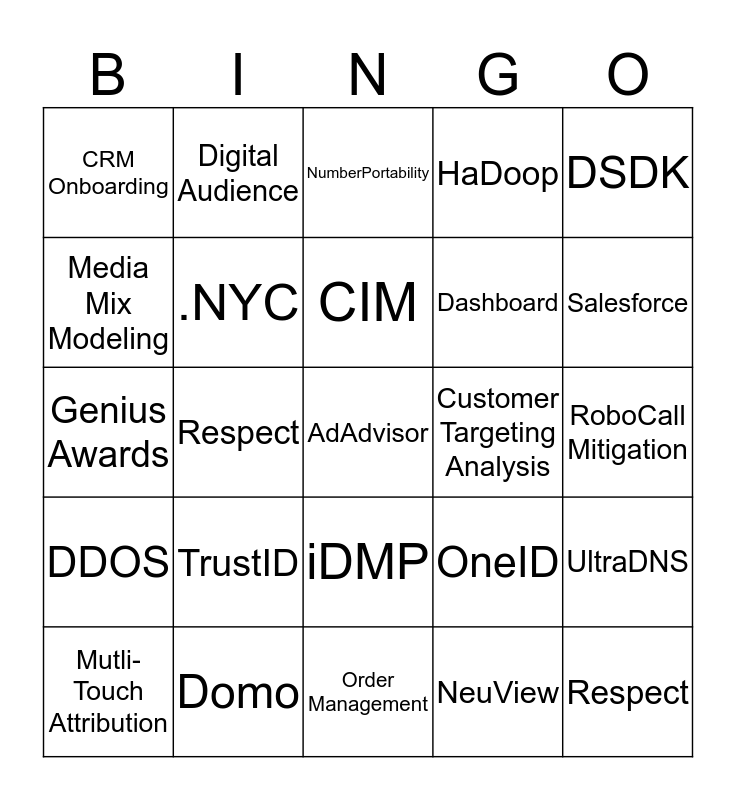 This bingo card has 33 words: Respect, Respect, Respect, RidgeTop, DDOS, .NYC, DSDK, Mutli-Touch Attribution, Digital Audience, ElementOne, CIM, NumberPortability, TCPA, Closed Loop, Customer Targeting Analysis, Salesforce, Domo, Genius Awards, TrustID, OneID, iDMP, Authentication, CRM Onboarding, RoboCall Mitigation, Order Management, AdAdvisor, HaDoop, Dashboard, Media Mix Modeling, UltraDNS, Addressable TV, NeuView and WorkDay.