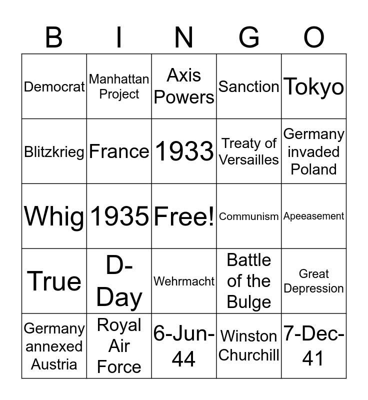 This bingo card has a free space and 24 words: D-Day, Royal Air Force, 1933, Germany annexed Austria, Tokyo, Democrat, Blitzkrieg, Manhattan Project, Communism, Wehrmacht, Treaty of Versailles, Whig, Battle of the Bulge, Great Depression, France, Winston Churchill, Apeeasement, Axis Powers, Germany invaded Poland, 1935, 7-Dec-41, True, Sanction and 6-Jun-44.