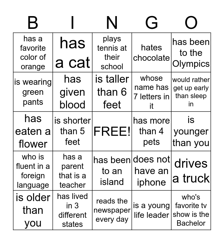 This bingo card has a free space and 24 words: has a parent that is a teacher, has lived in 3 different states, is taller than 6 feet, is older than you, has been to the Olympics, has a favorite color of orange, is wearing green pants, has a cat, has more than 4 pets, has been to an island, whose name has 7 letters in it, has eaten a flower, does not have an iphone, drives a truck, has given blood, is a young life leader, is younger than you, plays tennis at their school, would rather get up early than sleep in, is shorter than 5 feet, who's favorite tv show is the Bachelor, who is fluent in a foreign language, hates chocolate and reads the newspaper every day.