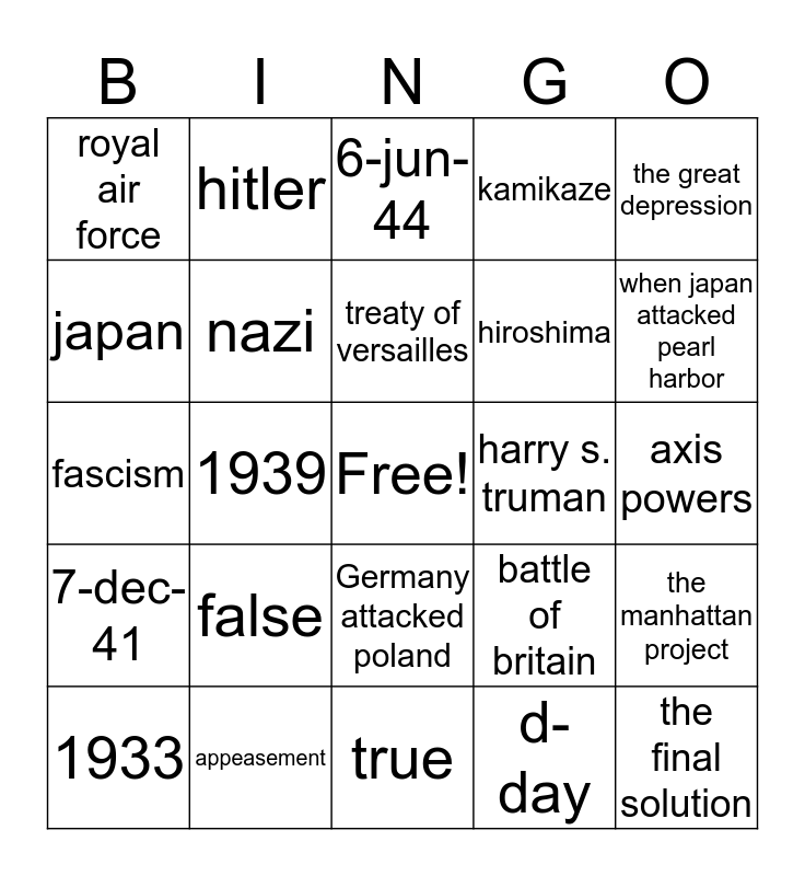 This bingo card has a free space and 24 words: false, appeasement, treaty of versailles, 1933, the great depression, royal air force, japan, hitler, harry s. truman, Germany attacked poland, hiroshima, fascism, battle of britain, the manhattan project, nazi, d-day, axis powers, 6-jun-44, when japan attacked pearl harbor, 1939, the final solution, 7-dec-41, kamikaze and true.