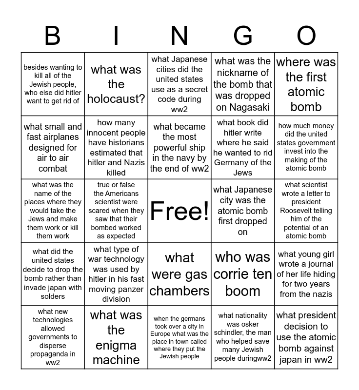 This bingo card has a free space and 24 words: what type of war technology was used by hitler in his fast moving panzer division, what was the enigma machine, what became the most powerful ship in the navy by the end of ww2, what new technologies allowed governments to disperse propaganda in ww2, where was the first atomic bomb, besides wanting to kill all of the Jewish people, who else did hitler want to get rid of, what small and fast airplanes designed for air to air combat, what was the holocaust?, what Japanese city was the atomic bomb first dropped on, what were gas chambers, what book did hitler write where he said he wanted to rid Germany of the Jews, what was the name of the places where they would take the Jews and make them work or kill them work, who was corrie ten boom, what young girl wrote a journal of her life hiding for two years from the nazis, how many innocent people have historians estimated that hitler and Nazis killed, what nationality was osker schindler, the man who helped save many Jewish people duringww2, what scientist wrote a letter to president Roosevelt telling him of the potential of an atomic bomb, what Japanese cities did the united states use as a secret code during ww2, how much money did the united states government invest into the making of the atomic bomb, true or false the Americans scientist were scared when they saw that their bombed worked as expected, what president decision to use the atomic bomb against japan in ww2, what did the united states decide to drop the bomb rather than invade japan with solders, what was the nickname of the bomb that was dropped on Nagasaki and when the germans took over a city in Europe what was the place in town called where they put the Jewish people.