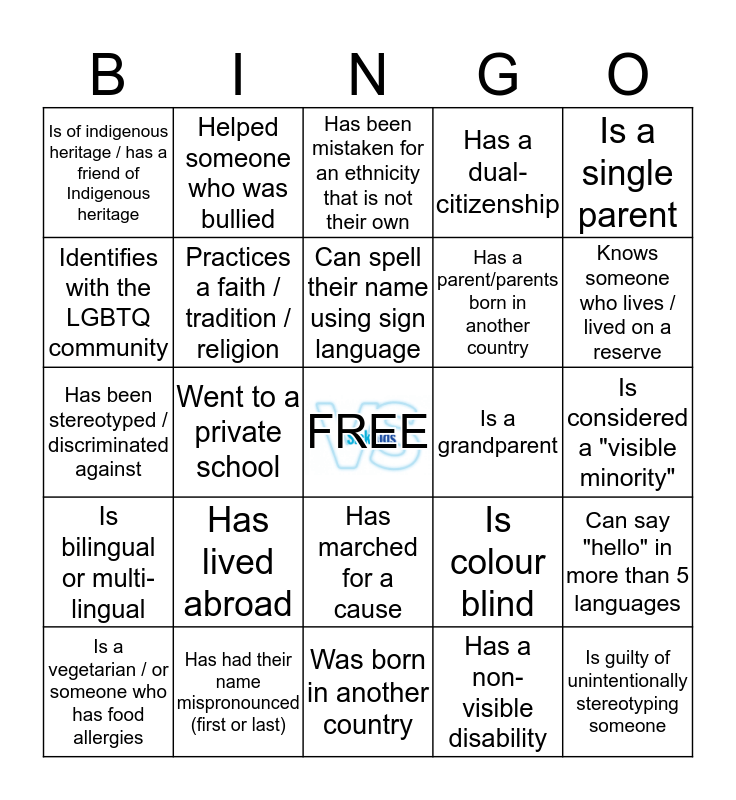 This bingo card has a free space and 24 words: Has lived abroad, Has had their name mispronounced (first or last), Can spell their name using sign language, Is a vegetarian / or someone who has food allergies, Is a single parent, Is of indigenous heritage / has a friend of Indigenous heritage, Identifies with the LGBTQ community, Helped someone who was bullied, Is a grandparent, Has marched for a cause, Has a parent/parents born in another country, Has been stereotyped / discriminated against, Is colour blind, Can say "hello" in more than 5 languages, Practices a faith / tradition / religion, Has a non-visible disability, Is considered a "visible minority", Has been mistaken for an ethnicity that is not their own, Knows someone who lives / lived on a reserve, Went to a private school, Is guilty of unintentionally stereotyping someone, Is bilingual or multi-lingual, Has a dual-citizenship and Was born in another country.