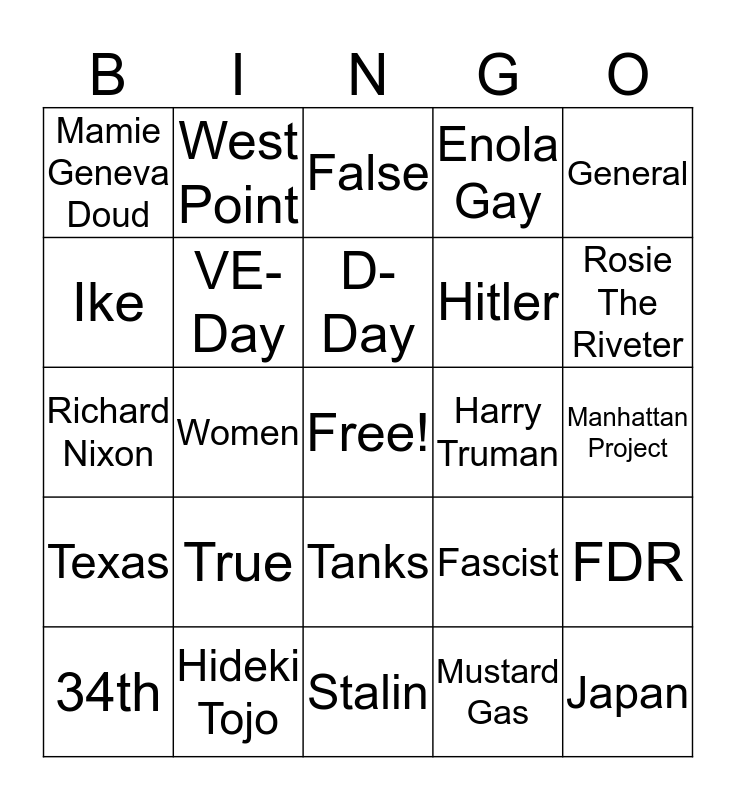 This bingo card has a free space and 24 words: 34th, True, D-Day, Mustard Gas, General, Mamie Geneva Doud, West Point, False, Harry Truman, Manhattan Project, Richard Nixon, VE-Day, Fascist, FDR, Ike, Hideki Tojo, Stalin, Enola Gay, Rosie The Riveter, Texas, Women, Tanks, Hitler and Japan.