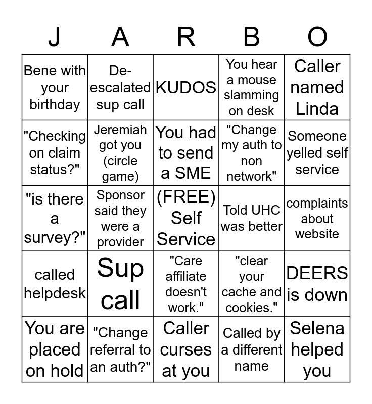 This bingo card has a free space and 24 words: You are placed on hold, Sup call, You had to send a SME, Called by a different name, Caller named Linda, Bene with your birthday, De-escalated sup call, KUDOS, Told UHC was better, complaints about website, "is there a survey?", Jeremiah got you (circle game), "clear your cache and cookies.", DEERS is down, "Checking on claim status?", "Change referral to an auth?", Caller curses at you, You hear a mouse slamming on desk, Someone yelled self service, called helpdesk, Sponsor said they were a provider, "Care affiliate doesn't work.", "Change my auth to non network" and Selena helped you.