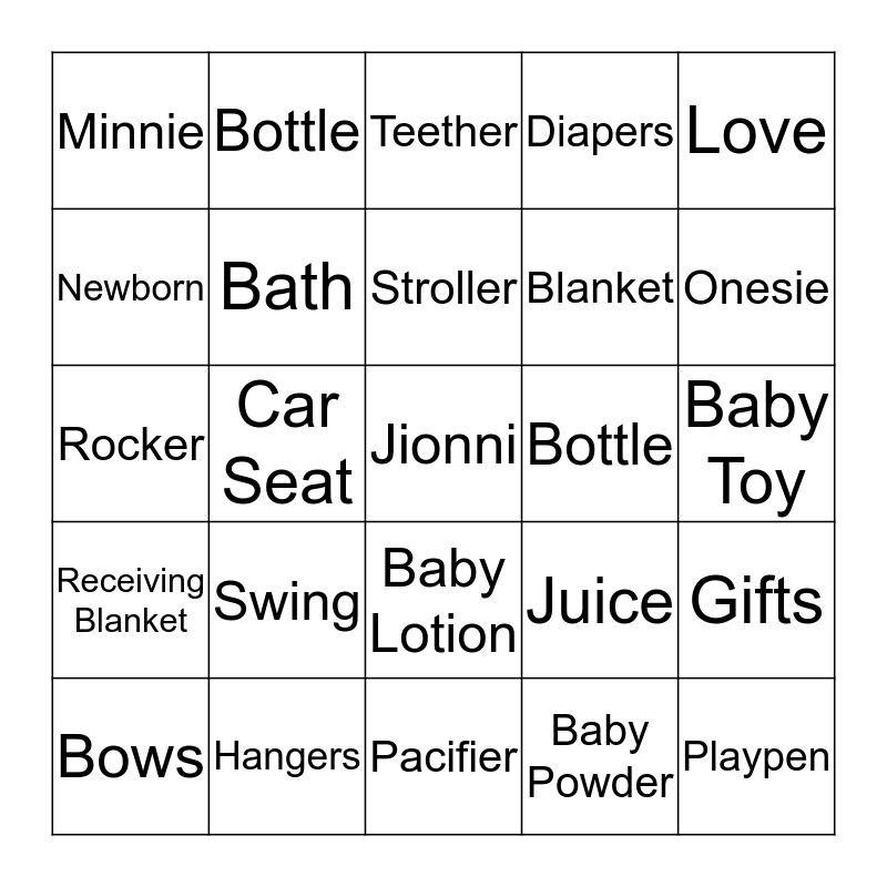 This bingo card has a free space and 24 words: Swing, Hangers, Stroller, Bows, Love, Minnie, Newborn, Bottle, Bottle, Baby Lotion, Blanket, Rocker, Juice, Gifts, Bath, Baby Powder, Baby Toy, Teether, Onesie, Car Seat, Playpen, Receiving Blanket, Diapers and Pacifier.