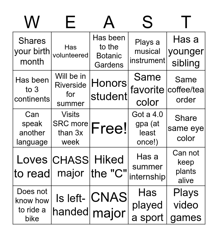 This bingo card has a free space and 35 words: Has not seen Avengers Endgame, Does not like boba, Has a pet, Will be in Riverside for summer, Hiked the "C", Plays a musical instrument, Has been to 3 continents, First-generation college student, Honors student, Studied Abroad, Can speak another language, Has a younger sibling, Has broken a bone, Has a Disneyland pass, Shares your birth month, Got a 4.0 gpa (at least once!), Has played a sport, Visits SRC more than 3x week, Loves to read, Plays video games, Has a summer internship, Does not know how to ride a bike, Can not keep plants alive, Is left-handed, Has been to the Botanic Gardens, Same coffee/tea order, Can quote at least 3 vines, Has worked fast food, Same favorite color, Share same eye color, Someone you have not met before, CNAS major, CHASS major, Has volunteered and Knows at least 4 Pokemon.