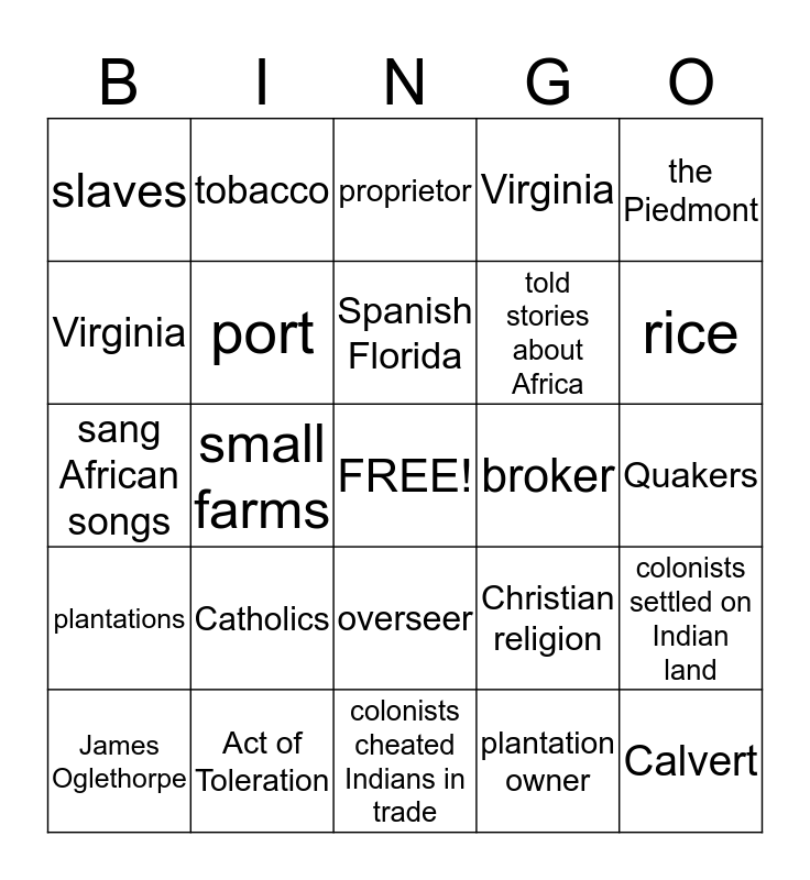 This bingo card has a free space and 24 words: Catholics, Act of Toleration, Spanish Florida, James Oglethorpe, the Piedmont, slaves, Virginia, tobacco, broker, overseer, told stories about Africa, sang African songs, Christian religion, colonists settled on Indian land, port, plantation owner, Quakers, proprietor, rice, small farms, Calvert, plantations, Virginia and colonists cheated Indians in trade.