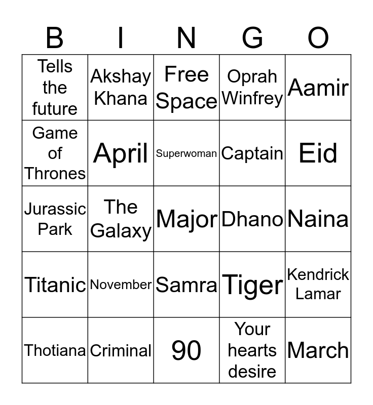 This bingo card has 30 words: Criminal, Mango, The Galaxy, Rameez, Tells the future, Free Space, April, Samra, Dhano, 90, Naina, Major, Your hearts desire, March, Eid, 38, Tiger, Titanic, November, Aamir, Jurassic Park, Leela, Akshay Khana, Captain, Game of Thrones, Oprah Winfrey, Kendrick Lamar, Thotiana, Superwoman and Smile.