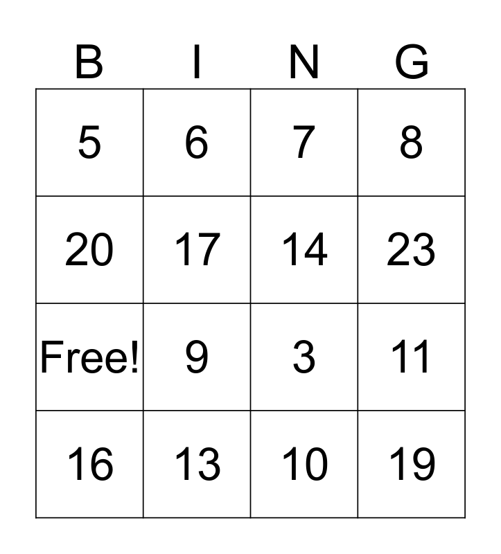 This bingo card has 25 words: 1, 2, 3, 4, 5, 6, 7, 8, Free!, 9, 10, 11, 12, 13, 14, 15, 16, 17, 18, 19, 20, 21, 22, 23 and 24.