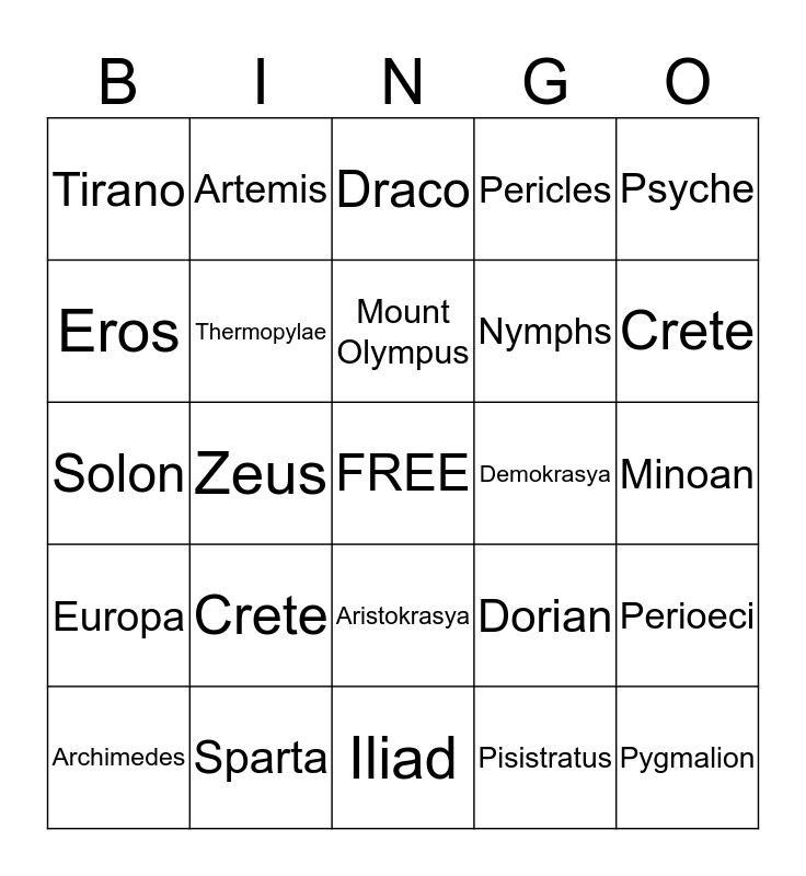 This bingo card has a free space and 108 words: Aphrodite, Eros, Zeus, Ligang Delian, Corinth, Olympus, Poseidon, Underworld, Sparta, Pericles, Demokrasya, Hades, Pisistratus, Solon, Psyche, Draco, Artemis, Dionysus, Polis, Athens, Crete, Europa, Acropolis, Olympics, Aphrodite, Psyche, Eros, Pericles, Aristotle, Homophilia, Hellas, Sparta, Corinth, Athens, Ligang Delian, Draco, Cleisthenes, Socrates, Plato, Pygmalion, Galatea, Homer, Iliad, Odyssey, Demosthenes, Thermopylae, Olympics, Mount Olympus, Totalitaryanismo, Demokrasya, Oligarkiya, Crete, Europa, Zeus, Poseidon, Hades, Athena, Underworld, Patriarchal, Tirano, Polis, Phratry, Thebes, Dionysus, Persephone, Ares, Hermes, Perioeci, Helot, Dorian, Aristokrasya, Solon, Pisistratus, Arkon, Hydra, Cerberus, Hercules, Odysseus, Perseus, Artemis, Eurydice, Mythology, Theseus, Cronos, Gaea, Rhea, Uranus, Hestia, Hera, Tartarus, Bellerophon, Nymphs, Medusa, The Republic, Parthenon, Hephaestus, Pythagoras, Archimedes, Euclid, Pelopponesian War, Sappho, Tyranny, King Leonidas, Persians, Alexander the Great, Xerxes, Minoan and Mycenaean.