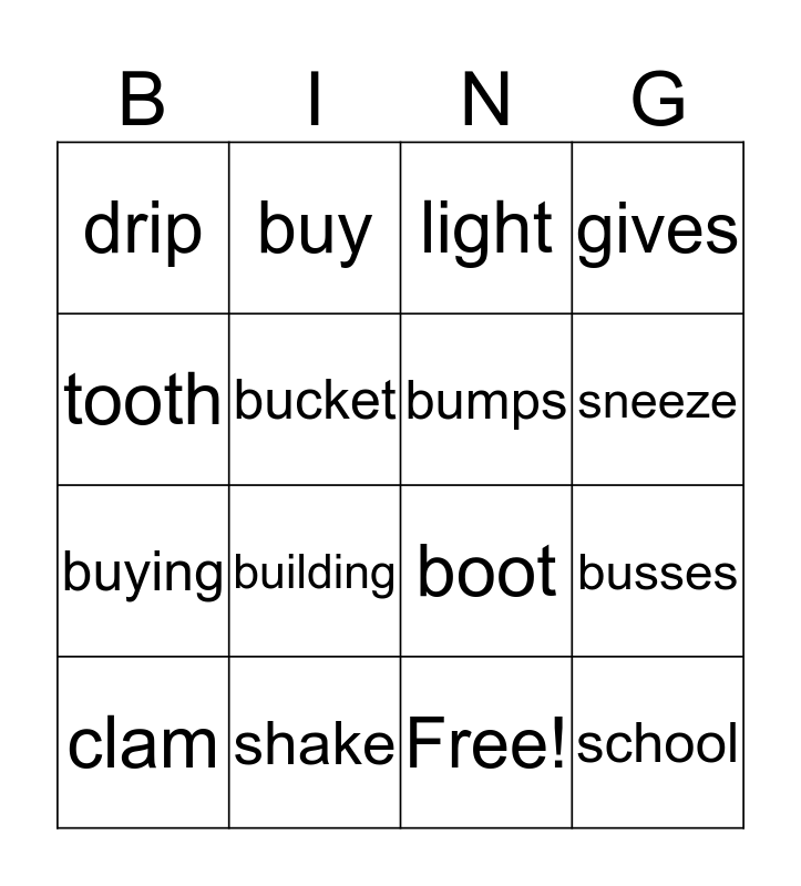 This bingo card has 17 words: Free!, clam, light, drip, building, gives, busses, bumps, sneeze, bucket, shake, boot, tooth, buy, buying, summer and school.