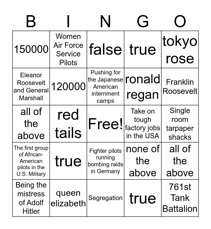 This bingo card has a free space and 24 words: true, queen elizabeth, Pushing for the Japanese American internment camps, Being the mistress of Adolf Hitler, tokyo rose, 150000, Eleanor Roosevelt and General Marshall, Women Air Force Service Pilots, Take on tough factory jobs in the USA, Fighter pilots running bombing raids in Germany, ronald regan, all of the above, none of the above, all of the above, 120000, true, Single room tarpaper shacks, false, Franklin Roosevelt, red tails, 761st Tank Battalion, The first group of African-American pilots in the U.S. Military, true and Segregation.