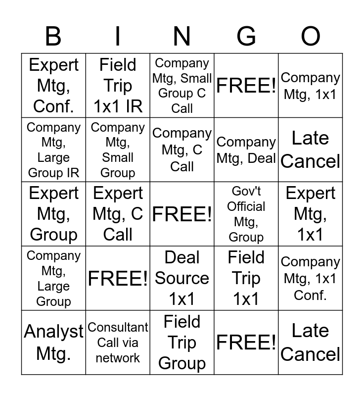 This bingo card has a free space and 24 words: FREE!, Consultant Call via network, Company Mtg, C Call, Analyst Mtg., Company Mtg, 1x1, Expert Mtg, Conf., Company Mtg, Large Group IR, Field Trip 1x1 IR, Gov't Official Mtg, Group, Deal Source 1x1, Company Mtg, Deal, Expert Mtg, Group, Field Trip 1x1, Company Mtg, 1x1 Conf., Company Mtg, Small Group, FREE!, Expert Mtg, 1x1, Company Mtg, Small Group C Call, Late Cancel, Expert Mtg, C Call, Late Cancel, Company Mtg, Large Group, FREE! and Field Trip Group.