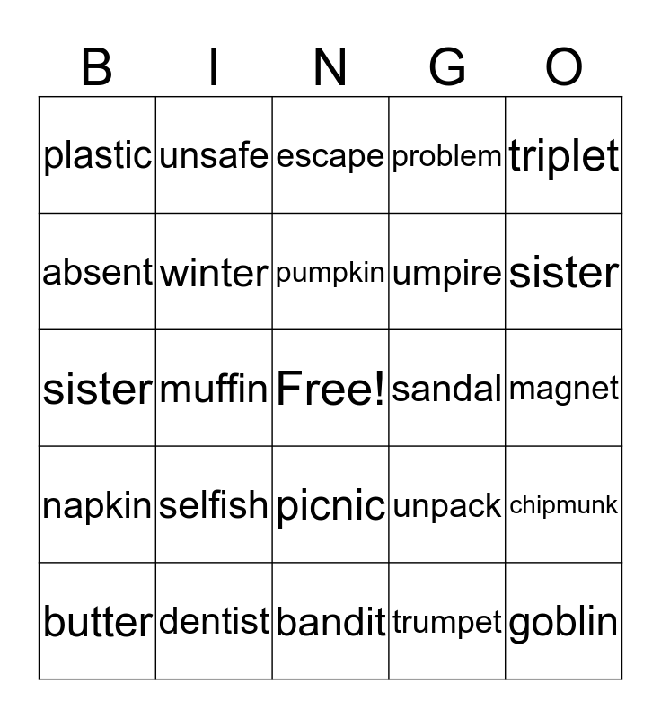 This bingo card has a free space and 29 words: butter, rabbit, muffin, contest, plastic, escape, winter, selfish, sandal, dentist, magnet, goblin, bandit, trumpet, sister, costume, picnic, napkin, triplet, sister, unpack, public, umpire, absent, problem, unsafe, chipmunk, pumpkin and slippers.