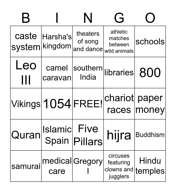 This bingo card has a free space and 59 words: foot binding, medical care, Noble Eightfold Path, Quran, circuses featuring clowns and jugglers, Abbasid dynasty, camel caravan, fast ripening rice, libraries, northern India, athletic matches between wild animals, Muslim invaders, Leo III, theme system, al-Andalus, caste system, Hindu temples, schools, Justinian, southern India, chariot races, theaters of song and dance, samurai, Buddhism, Vietnam, Xuanzang, flying cash, hajj, 800, Neo-Confucianism, monasteries, India, orphanages, letters of credit, Harsha's kingdom, checks, promissory notes, 1054, gunpowder, Vikings, two Christian monks, Islamic Spain, paper money, Korea, dar al-Islam, Song dynasty, Umayyad dynasty, submission, Five Pillars, Gregory I, Charlemagne, veiling of women, paper, Ka'ba in Mecca, Tang dynasty, hijra, Hungarian Magyar invaders, equal-field system and caliph.