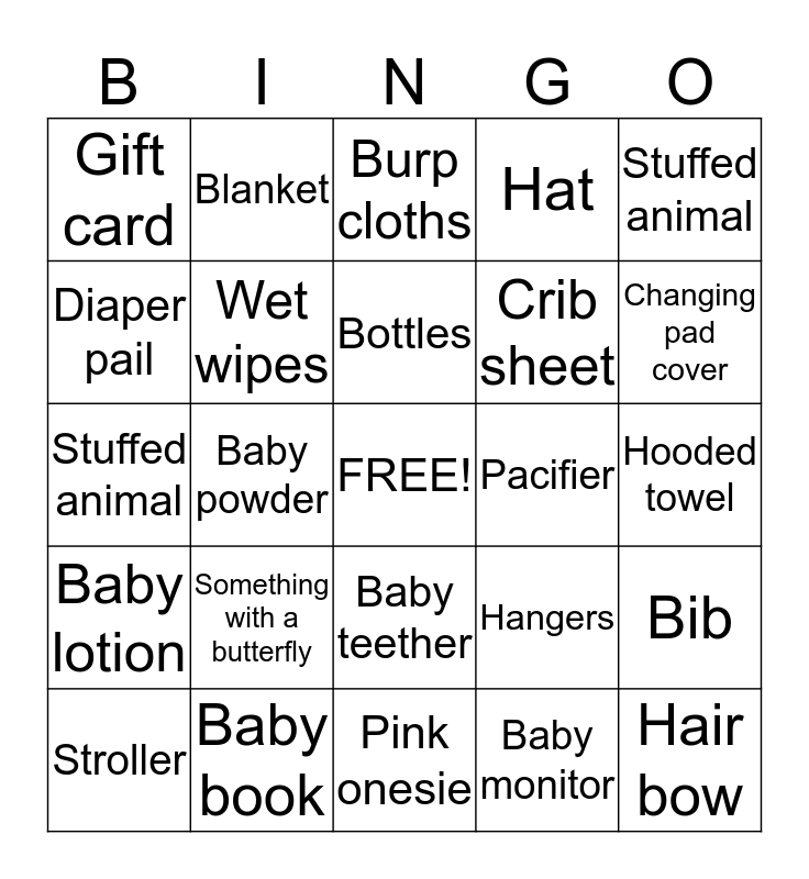 This bingo card has a free space and 32 words: Baby monitor, Ointment, Baby powder, Baby shampoo, Baby lotion, Wet wipes, Stuffed animal, Bib, Blanket, Socks, Bottles, Burp cloths, Diapers, High chair, Pacifier, Rattle, Stroller, Stuffed animal, Baby teether, Something with a butterfly, Hangers, Washcloths, Hooded towel, Baby book, Hair bow, Hat, Crib sheet, Diaper pail, Gift card, Pink onesie, Dress and Changing pad cover.