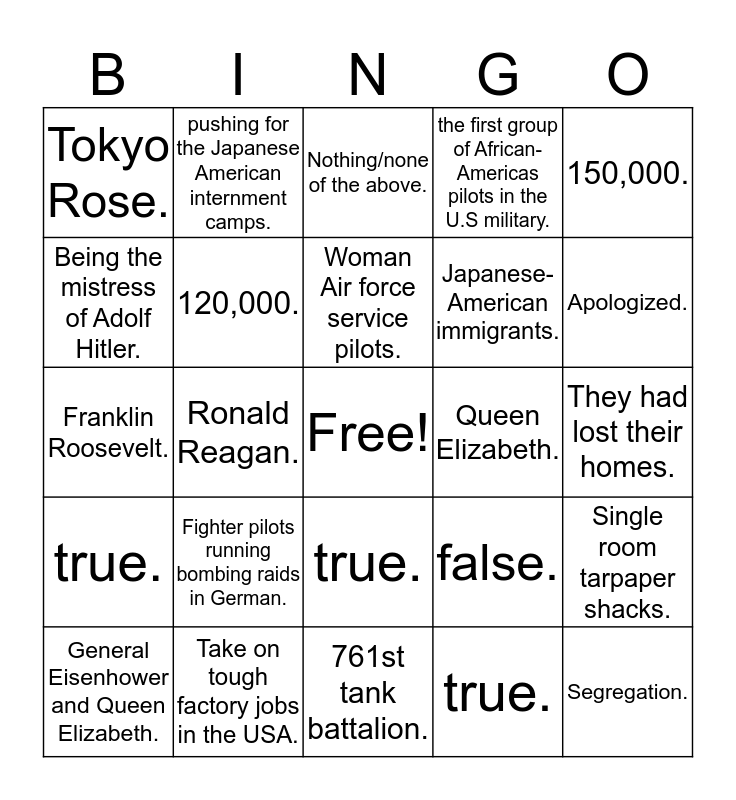 This bingo card has a free space and 24 words: Fighter pilots running bombing raids in German., Take on tough factory jobs in the USA., Woman Air force service pilots., General Eisenhower and Queen Elizabeth., 150,000., Tokyo Rose., Being the mistress of Adolf Hitler., pushing for the Japanese American internment camps., Queen Elizabeth., true., Japanese-American immigrants., Franklin Roosevelt., false., Single room tarpaper shacks., 120,000., true., They had lost their homes., Nothing/none of the above., Apologized., Ronald Reagan., Segregation., true., the first group of African-Americas pilots in the U.S military. and 761st tank battalion..