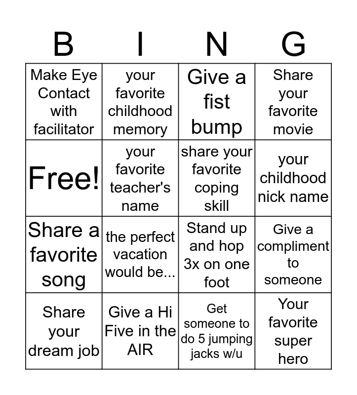 This bingo card has 16 words: Give a Hi Five in the AIR, Give a compliment to someone, Give a fist bump, Make Eye Contact with facilitator, Share a favorite song, your favorite childhood memory, Stand up and hop 3x on one foot, Get someone to do 5 jumping jacks w/u, Free!, your favorite teacher's name, Share your dream job, Share your favorite movie, the perfect vacation would be..., your childhood nick name, share your favorite coping skill and Your favorite super hero.
