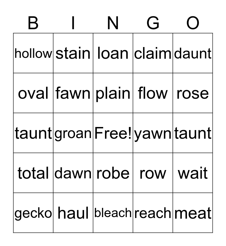 This bingo card has a free space and 29 words: gecko, poach, groan, coal, hollow, loan, fawn, dawn, yawn, haul, taunt, meat, bleach, reach, rose, pose, robe, total, daunt, taunt, row, snow, flow, oval, claim, stain, wait, plain and main.