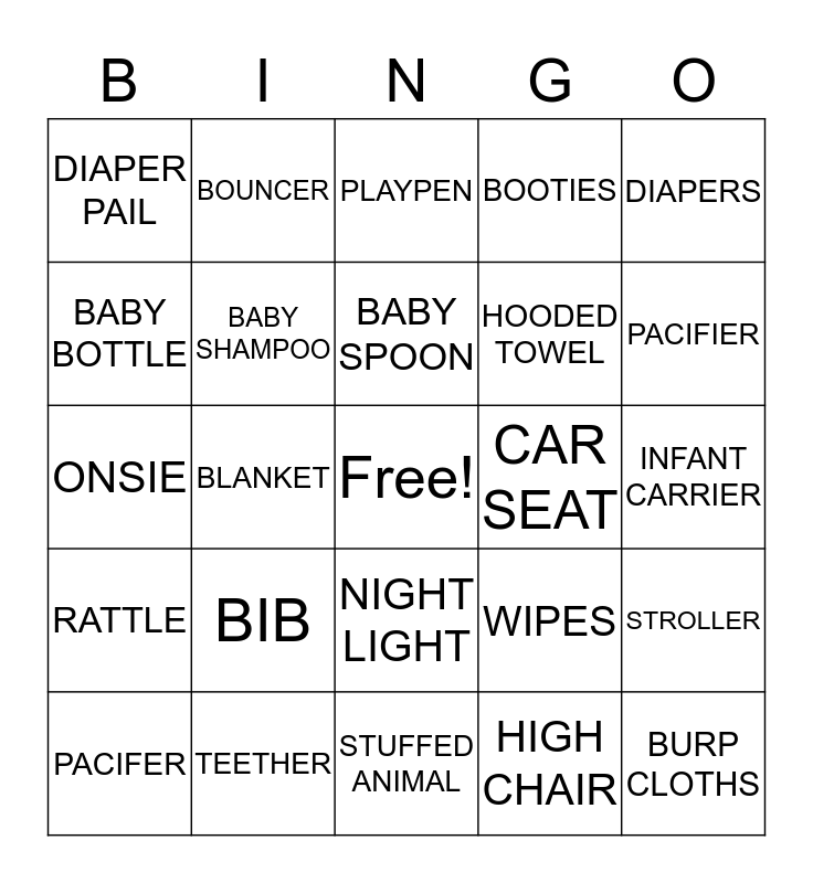 This bingo card has a free space and 24 words: BIB, TEETHER, BABY SPOON, PACIFER, DIAPERS, DIAPER PAIL, BABY BOTTLE, BOUNCER, CAR SEAT, NIGHT LIGHT, HOODED TOWEL, ONSIE, WIPES, STROLLER, BABY SHAMPOO, HIGH CHAIR, INFANT CARRIER, PLAYPEN, PACIFIER, BLANKET, BURP CLOTHS, RATTLE, BOOTIES and STUFFED ANIMAL.