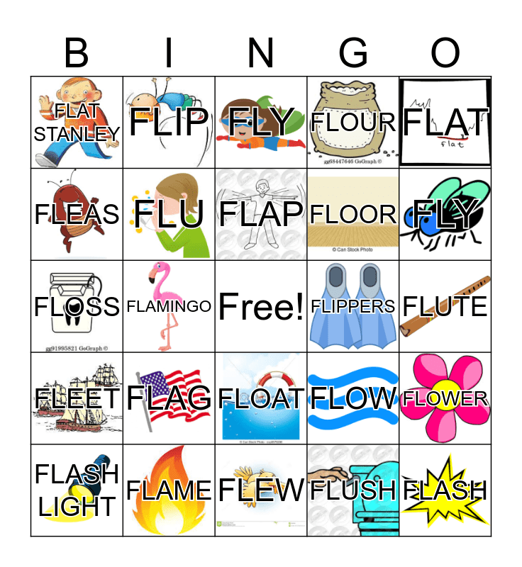 This bingo card has 24 images, a free space and 24 words: FLAG, FLAME, FLAP, FLASH LIGHT, FLAT, FLAT STANLEY, FLEAS, FLIP, FLIPPERS, FLOAT, FLOOR, FLOSS, FLOW, FLOWER, FLU, FLUSH, FLUTE, FLY, FLY, FLAMINGO, FLASH, FLEET, FLOUR and FLEW.