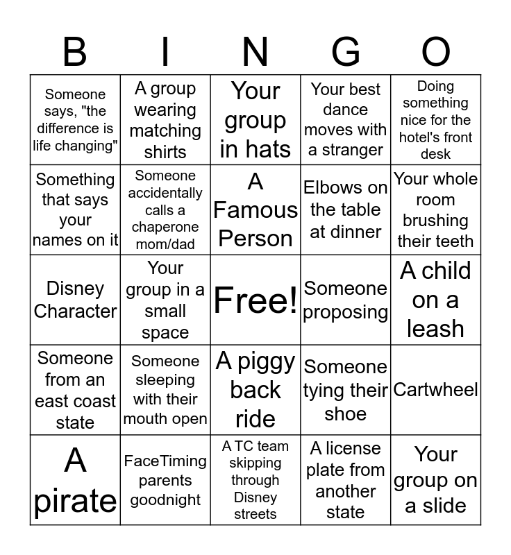 This bingo card has a free space and 24 words: Someone sleeping with their mouth open, FaceTiming parents goodnight, A Famous Person, A pirate, Doing something nice for the hotel's front desk, Someone says, "the difference is life changing", Something that says your names on it, A group wearing matching shirts, Someone proposing, A piggy back ride, Elbows on the table at dinner, Disney Character, Someone tying their shoe, Cartwheel, Someone accidentally calls a chaperone mom/dad, A license plate from another state, A child on a leash, Your group in hats, Your whole room brushing their teeth, Your group in a small space, Your group on a slide, Someone from an east coast state, Your best dance moves with a stranger and A TC team skipping through Disney streets.