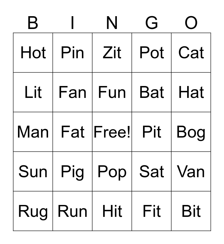 This bingo card has a free space and 24 words: Pig, Run, Fun, Rug, Cat, Hot, Lit, Pin, Pit, Pop, Bat, Man, Sat, Van, Fan, Fit, Bog, Zit, Hat, Fat, Bit, Sun, Pot and Hit.