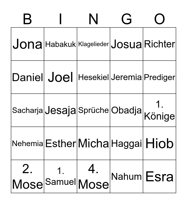 This bingo card has a free space and 38 words: 1. Mose, Hosea, 1. Chronik, Joel, Hiob, Esther, Hesekiel, Psalmen, Richter, Jeremia, Jesaja, Josua, Esra, 1. Könige, Daniel, Nehemia, Ruth, Klagelieder, Amos, Obadja, Jona, 1. Samuel, Prediger, 2. Mose, 3. Mose, 4. Mose, 5. Mose, 2. Samuel, 2. Könige, 2. Chronik, Hoheslied, Micha, Nahum, Habakuk, Zefanja, Haggai, Sacharja and Maleachi.