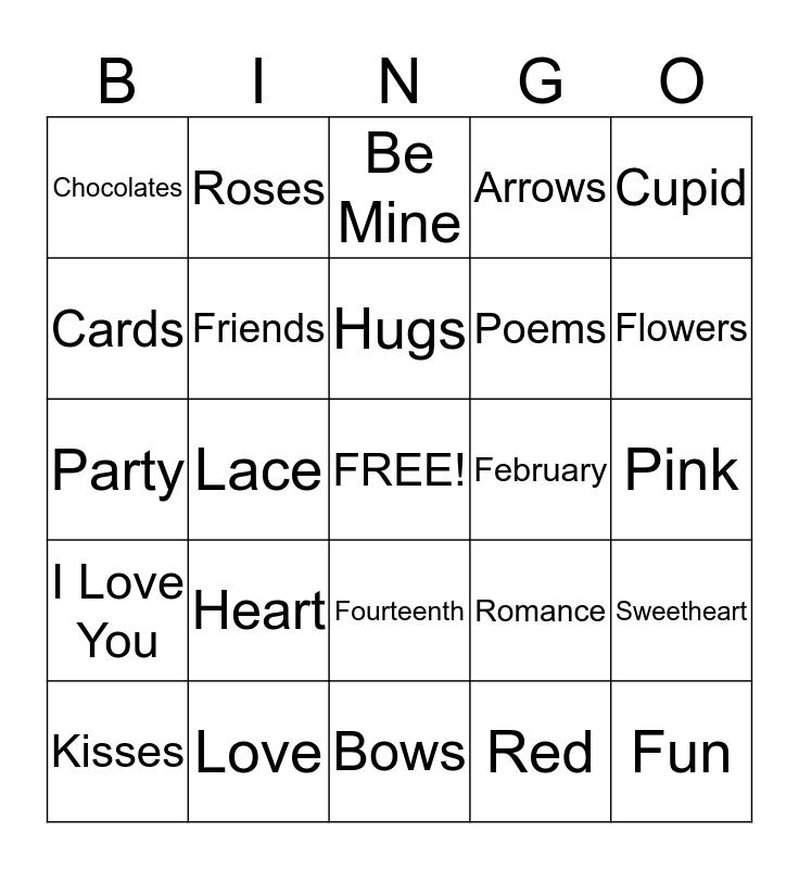 This bingo card has a free space and 24 words: Heart, Love, Hugs, Kisses, Cupid, Chocolates, Cards, Roses, February, Fourteenth, Poems, Party, Romance, Sweetheart, Friends, Red, Pink, Be Mine, Flowers, Lace, Fun, I Love You, Arrows and Bows.