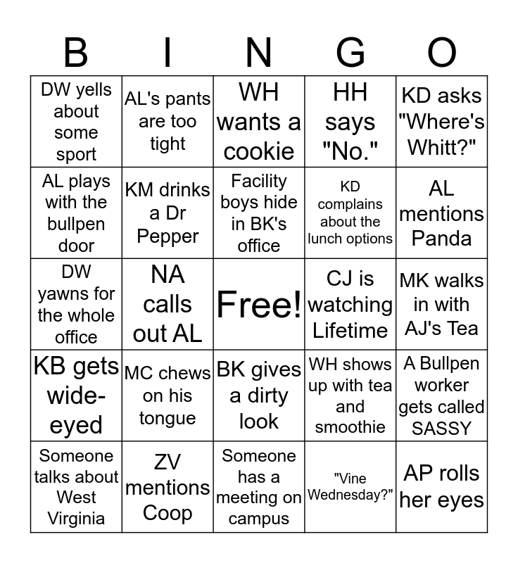 This bingo card has a free space and 40 words: WH gets shooketh, DW yawns for the whole office, AL practices his golf swing, KM drinks a Dr Pepper, ZV mentions Coop, BK gives a dirty look, Facility boys hide in BK's office, JD cracks a joke, KD asks "Where's Whitt?", KB gets wide-eyed, NA calls out AL, HH says "No.", AP rolls her eyes, MK walks in with AJ's Tea, CJ is watching Lifetime, MC chews on his tongue, AL says "U gon learn.", DW yells about some sport, ZV asks "What are you doing?", WH wants a cookie, A Bullpen worker gets called SASSY, "Vine Wednesday?", KD complains about the lunch options, AL plays with the bullpen door, KD talks about buying a house, WH ushes into Bullpen to spill tea, WH says "Guess what I found out?", AL says "I'm going to teach you something.", ZV is sick, KD mentions ZV's 6 girls, AL gets blamed for Bullpen prank, Someone talks about West Virginia, WH loses her phone, WH shows up with tea and smoothie, AL mentions Panda, Someone has a meeting on campus, AP mentions Zack/Ajax, Daniel makes a bald joke, AL's pants are too tight and HH stands with her hand on her hips.