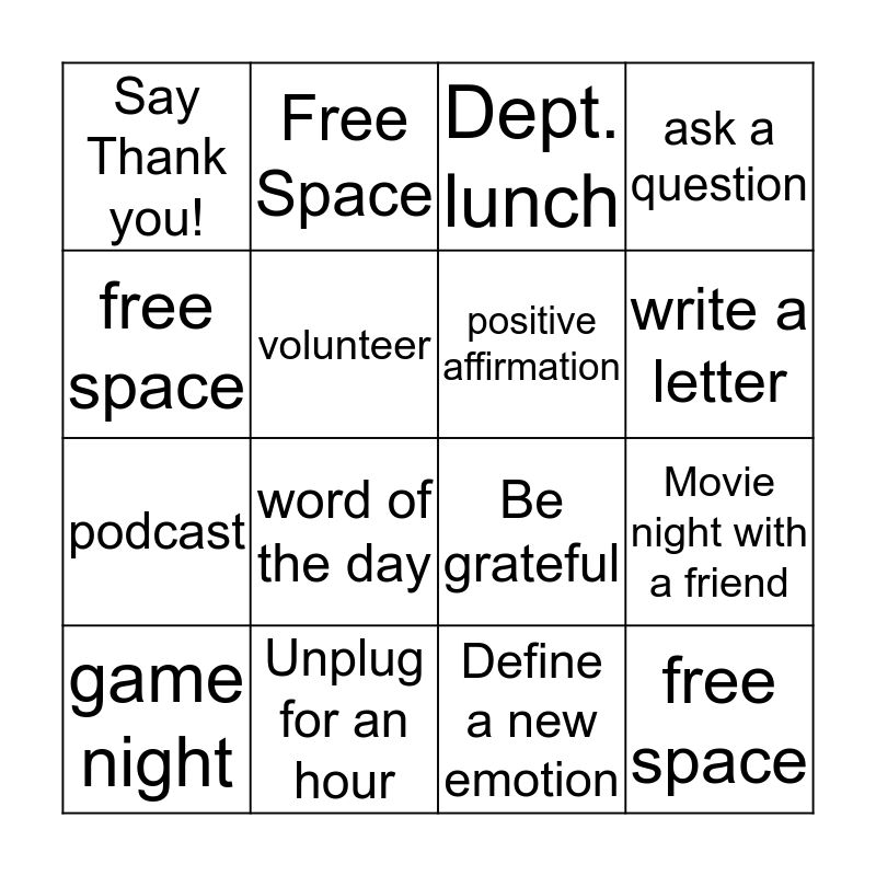 This bingo card has 16 words: Unplug for an hour, Movie night with a friend, Dept. lunch, Say Thank you!, podcast, Free Space, Be grateful, Define a new emotion, free space, volunteer, game night, ask a question, word of the day, write a letter, positive affirmation and free space.