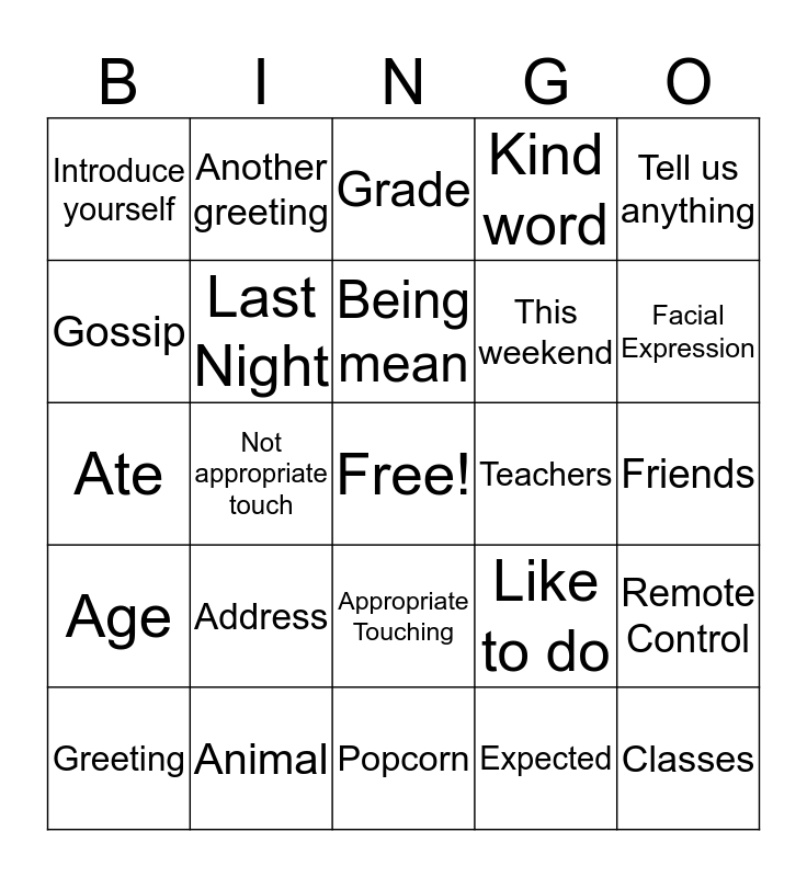This bingo card has a free space and 29 words: Greeting, Color, Not appropriate touch, Family, Introduce yourself, Grade, Last Night, Address, Teachers, Animal, Friends, Classes, Popcorn, Expected, Facial Expression, Tractors, Appropriate Touching, Age, Tell us anything, Ate, Like to do, Peep experiment, This weekend, Gossip, Kind word, Another greeting, Remote Control, Being mean and Feelings.