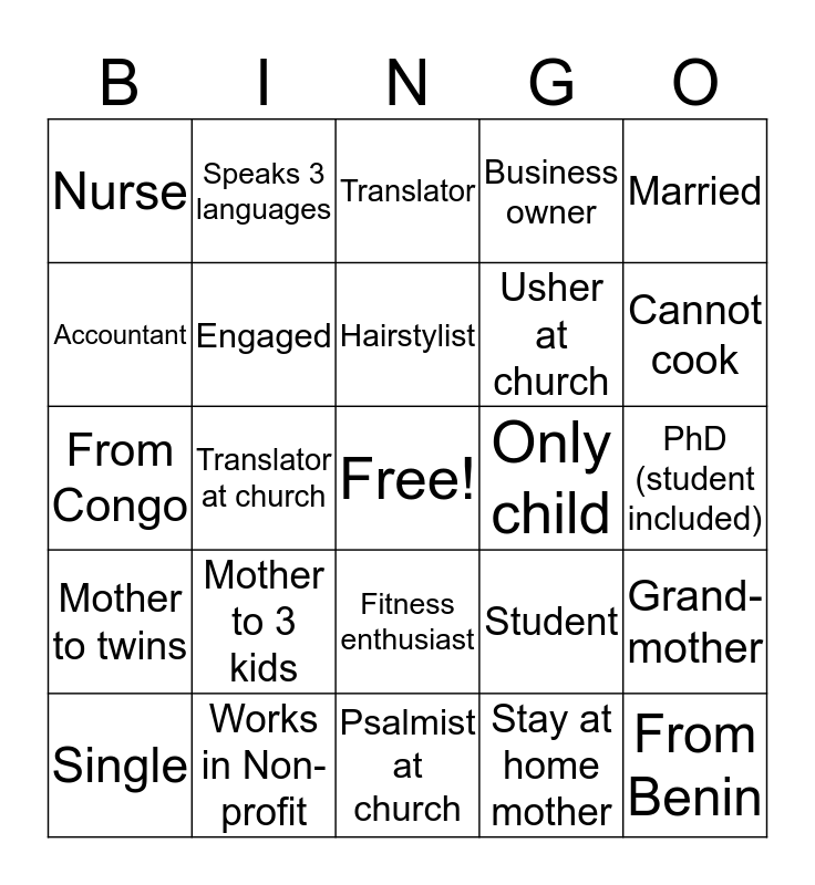 This bingo card has a free space and 24 words: Mother to 3 kids, Works in Non-profit, Hairstylist, Single, Married, Nurse, Accountant, Speaks 3 languages, Only child, Fitness enthusiast, Usher at church, From Congo, Student, Grand-mother, Engaged, Stay at home mother, PhD (student included), Translator, Cannot cook, Translator at church, From Benin, Mother to twins, Business owner and Psalmist at church.