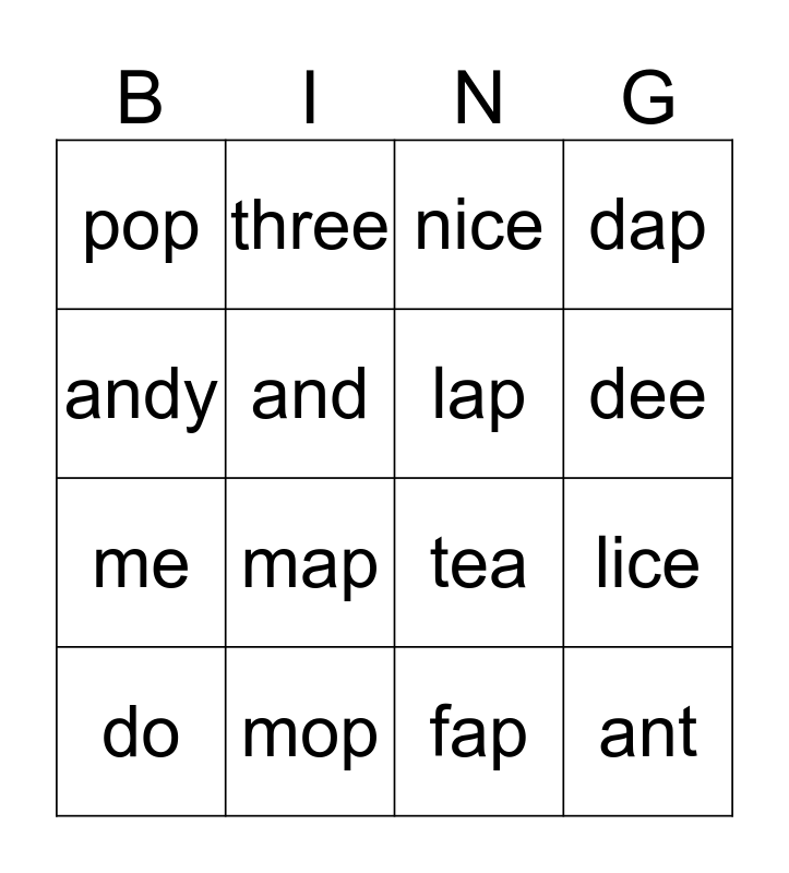 This bingo card has 20 words: do, food, nice, lice, cap, map, fap, dap, me, three, tea, dee, pop, mop, lap, sap, andy, and, an and ant.