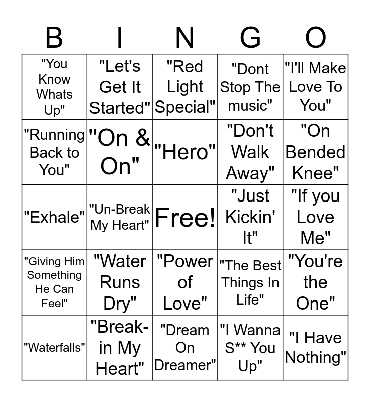 This bingo card has a free space and 159 words: “No Diggity”, “The Boy Is Mine”, "Real Love", "Hold On", "This is How We Do It", "Creep", "You Make Me Wanna", "No Scrubs", "Freak Like Me", "Remember the Time", "Just Kickin' It", "Too Close", "Don't Walk Away", "Fantasy", "Power of Love", "Don't Take it Personal", "Free your Mind", "Tell Me", "Hey Mr Dj", "I wanna be Down", "Bills, Bills, Bills", "Giving you The Benefit", "I'm your baby tonight", "Hit Me Off", "Lets Ride", "Scream", "You're the One", "The Best Things In Life", "Thong Song", "Return of The Mack", "Romantic", "Where My Girls At", "Don't Wanna Fall in Love", "Baby Baby Baby", "Feels Good", "Do Me", "I Wanna Love You", "So You like What You See", "This is For The Lover In You", "Do Me Right", "If Your Girl Only Knew", "Stay", "Groove Thing", "My Love is Your Love", "Got till Its Gone", "You Remind Me", "Emotions", "Get it on Tonight", "Jumping Jumping", "How Deep is Your Love", "Never Gonna Let You Go", "Dream On Dreamer", "I Belong To You", "Running Back to You", "I will Always Love You:, "Waterfalls", "End of The Road", "One Sweet Day", "Vision Of Love", "Save The Best For Last", "I'll Make Love To You", "I Have Nothing", "I Wanna S** You Up", "I Swear", "All My Life", "Un-Break My Heart", "Another Sad Love Song", "If I Ever Fall In Love", "Breathe Again", "On & On", "Bump N' Grind", "Twisted", "Hero", "Lady", "Nobody's Supposed To Be Here", "Say My Name", "Giving Him Something He Can Feel", "In my Bed", "I Wanna Know", "4 Seasons of Loneliness", "Have You ever", "Nobody Knows", "All The Things Your Man Wont DO", "Knocking The Boots", "When Can I see You", "My My My", "Back At One", "Can We Talk", "Spend My Life With You", "Every Time I close My Eyes", "Don't Leave Me", "Changing Faces", "Someone To Love", "Fortunate", "Exhale", "Not Gon Cry", "Anytime", "Down Low", "No Ordinary Love", "Water Runs Dry", "Love Takes Time", "On Bended Knee", "If you Love Me", "Who Can I Run To", "I'm Ready", "Nobody", "I can't Sleep Baby", "Tell Me What You Want Me To Do", "Red Light Special", "Love Should Have Brought You Home", "I'll Give All My Love To You", "Break-in My Heart", "Let's Chill", "I'm Still in Love With You", "Rub you the Right Way", "Angel of Mine", "Master Piece", "He's Mine", "Hold You Tight", "Heartbreak Hotel", "Brown Sugar", "Ex-Factor", "All for Love", "You Know Whats Up", Why You Get Funky On Me", "My Lovin", "It Never Rains", "One In A Million", "Hips Dont Lie", "Buttons", "Hey Ya", "Jenny From The Block", "Holla Back Girl", "Don't Cha", "Party Up", "Since You Been Gone", "Let's Get It Started", "In Da Club", "My Humps", "Smack That", "Gold Digger", "Dilemma", "It Wasn't Me", "Dont Stop The music", "Hot In Herre", "Get Low", "Ignition", "Sexy Back", "Crazy in Love", "SOS", "Naughty Girl", "1 2 Step", "Ridin", "Lady Marmalade", "Work It", "Milk Shake", "Switch", "Milkshake" and "Lose My Breath".