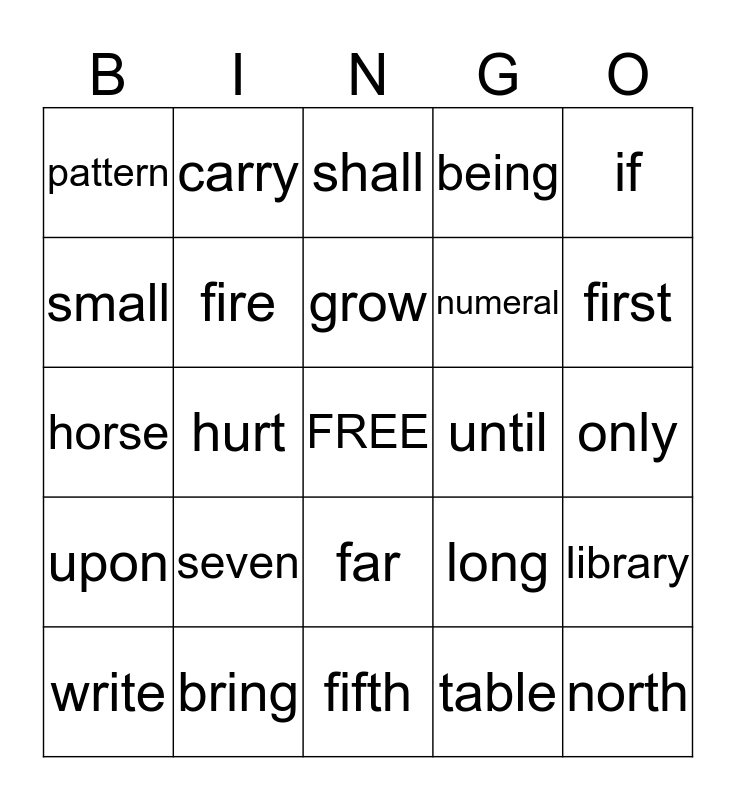 This bingo card has a free space and 24 words: seven, bring, grow, write, if, pattern, small, carry, until, far, numeral, horse, long, library, fire, table, only, shall, first, hurt, north, upon, being and fifth.
